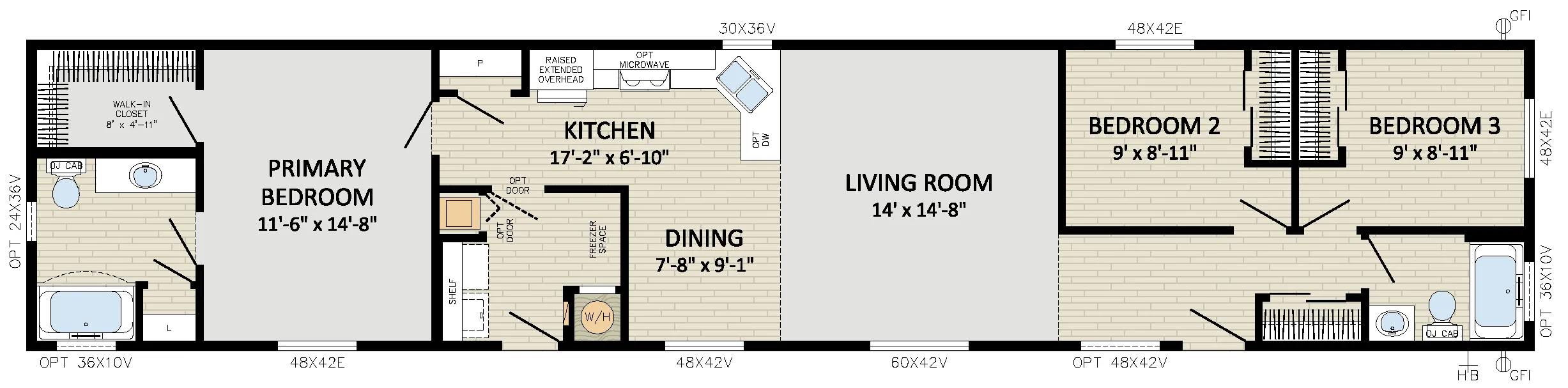 - Front Door: 36" 2-Panel Insulated with dead bolt and peep hole