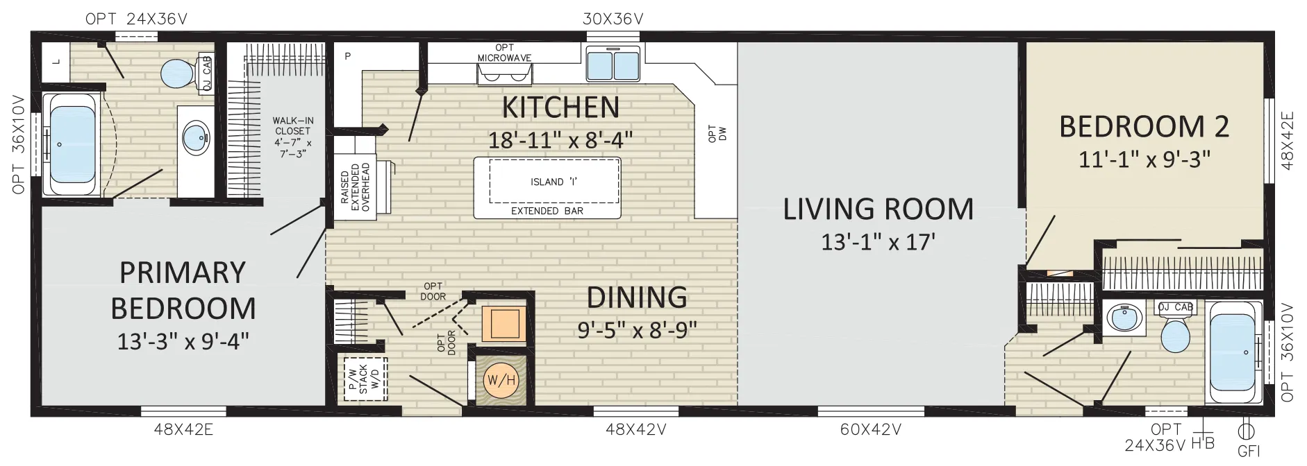 - Front Door: 36" 2-Panel Insulated with dead bolt and peep hole