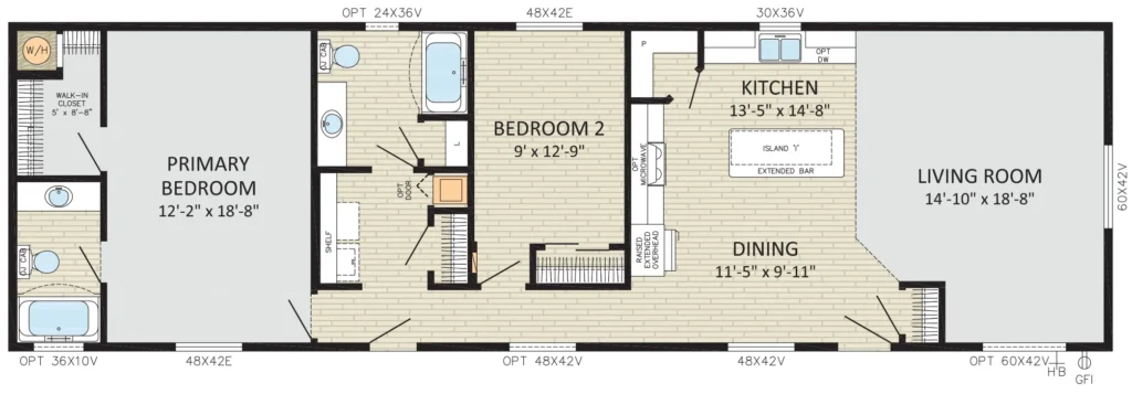 - Front Door: 36" 2-Panel Insulated with dead bolt and peep hole