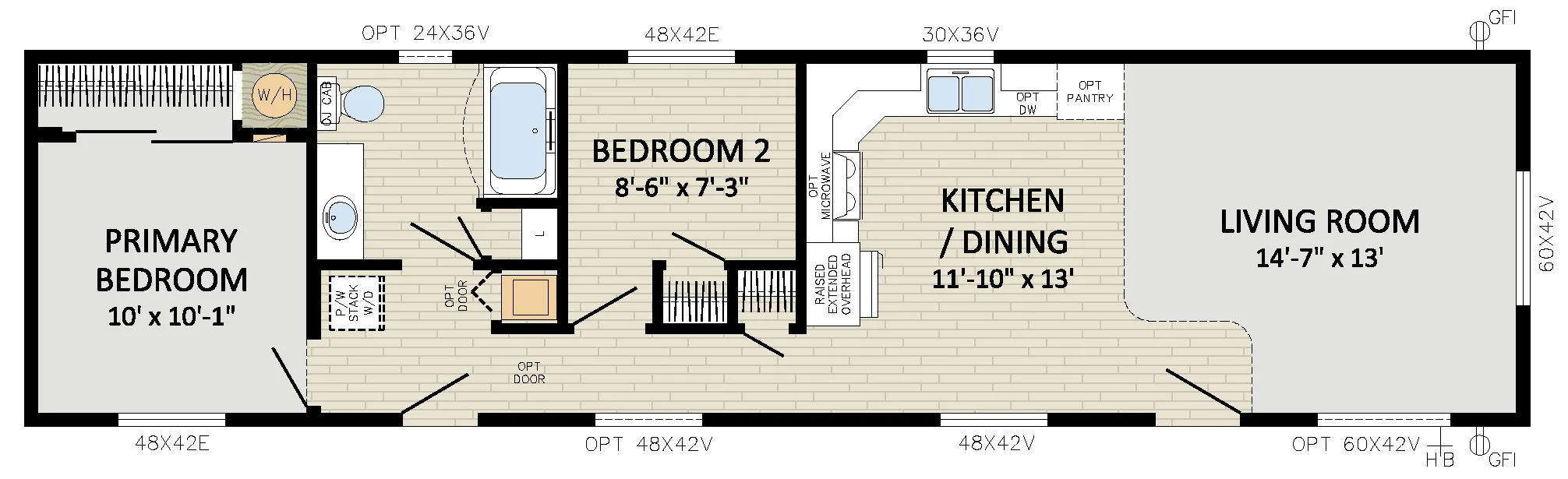 - Front Door: 36" 2-Panel Insulated with dead bolt and peep hole