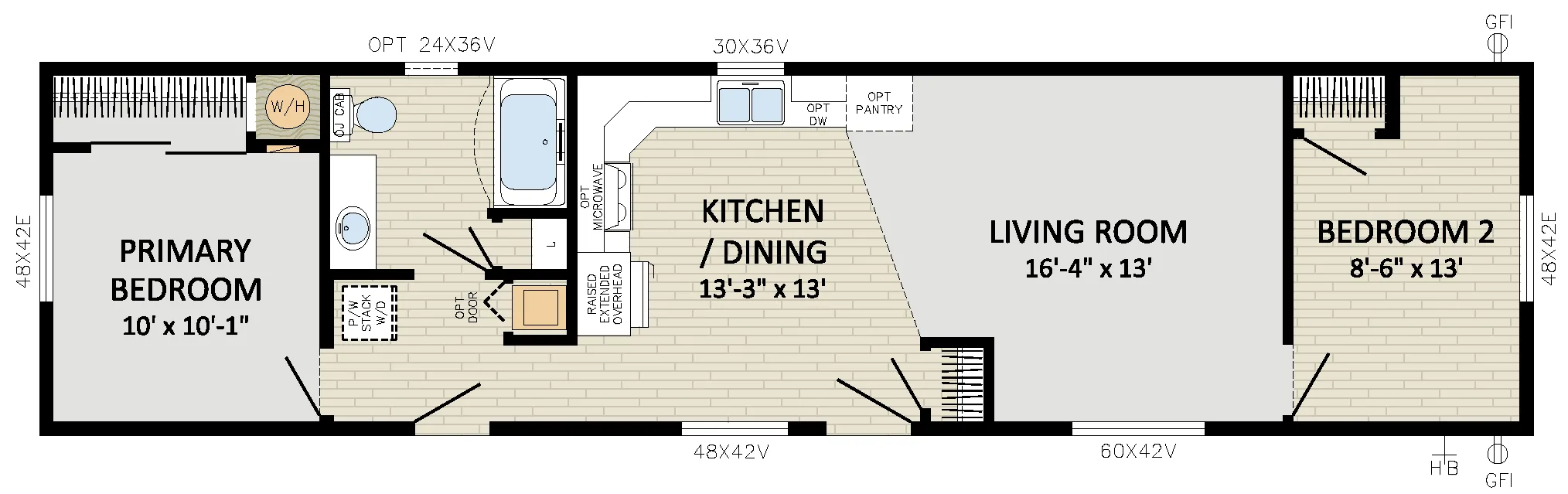 - Front Door: 36" 2-Panel Insulated with dead bolt and peep hole