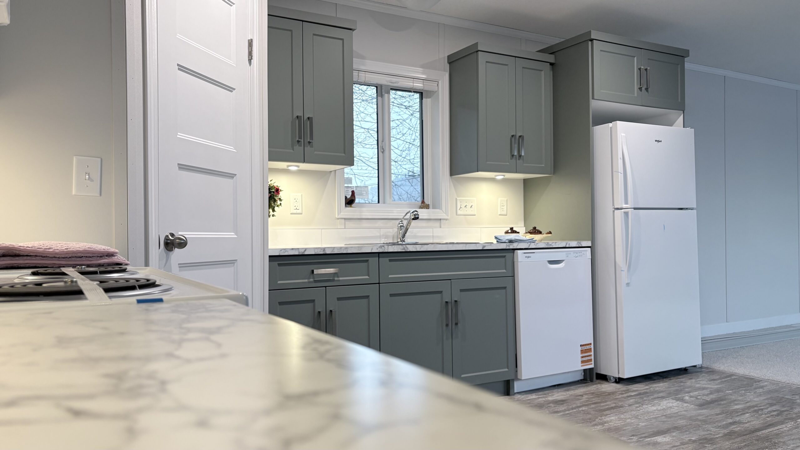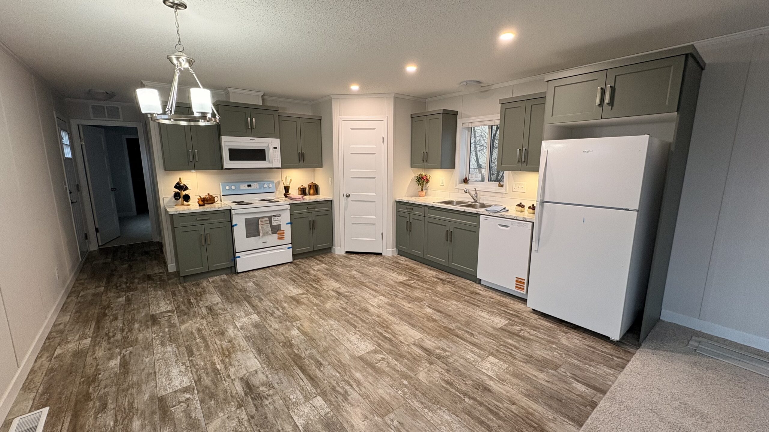 - Fridge, coiled range, dishwasher, microwave range hood fan