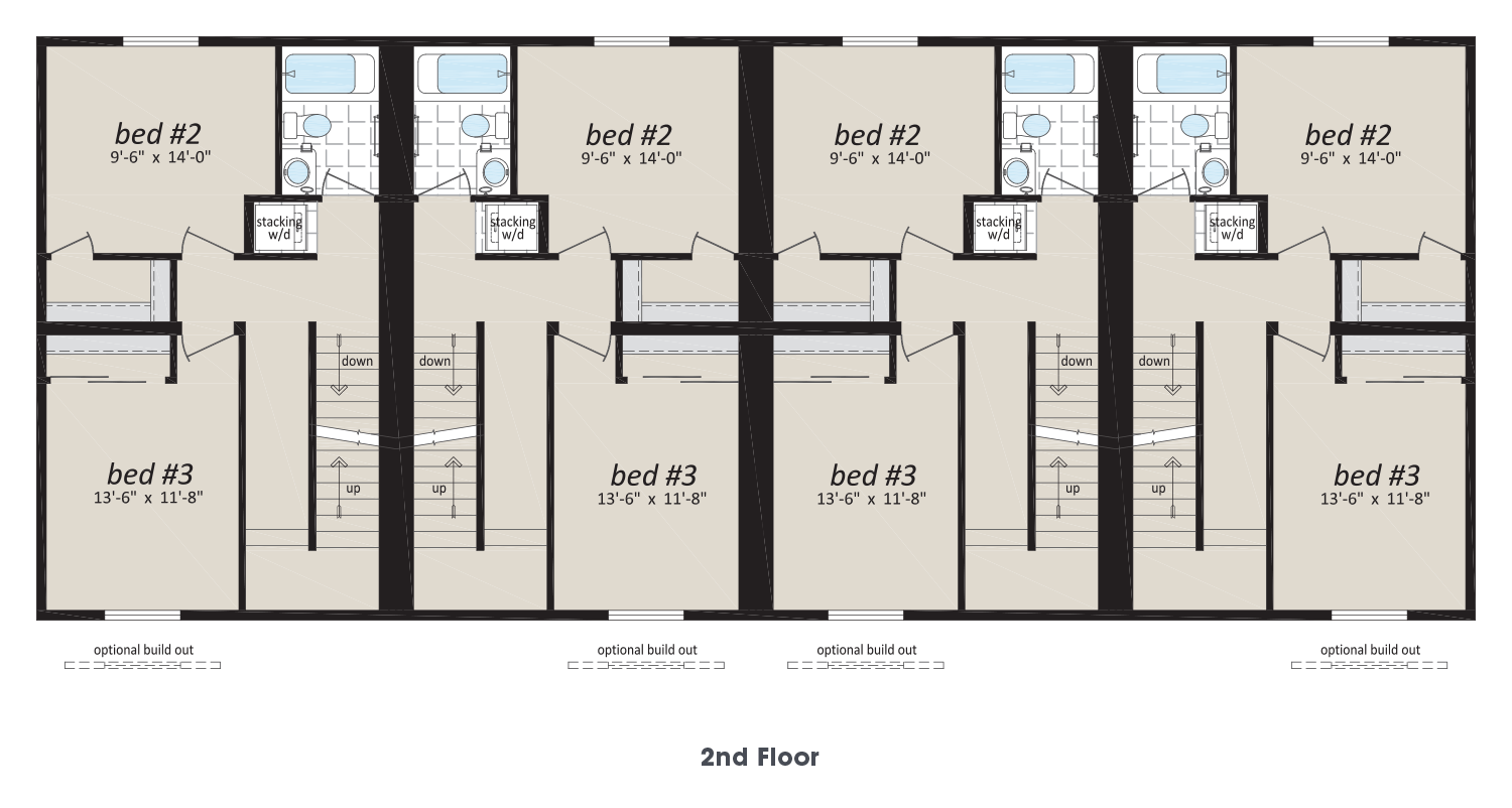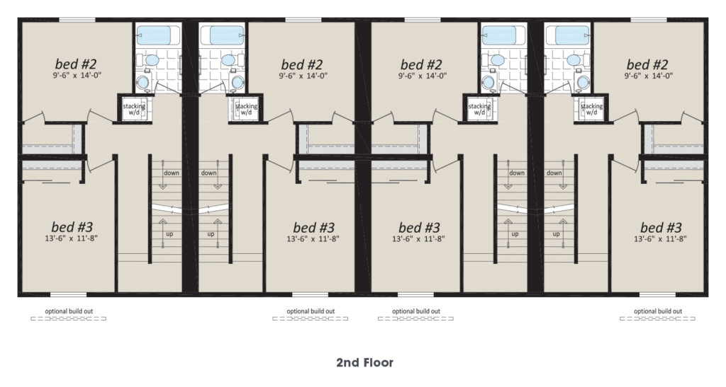 - Plumbed/Wired for Side by Side or Stacking Washer and Dryer – Each Suite as per plan